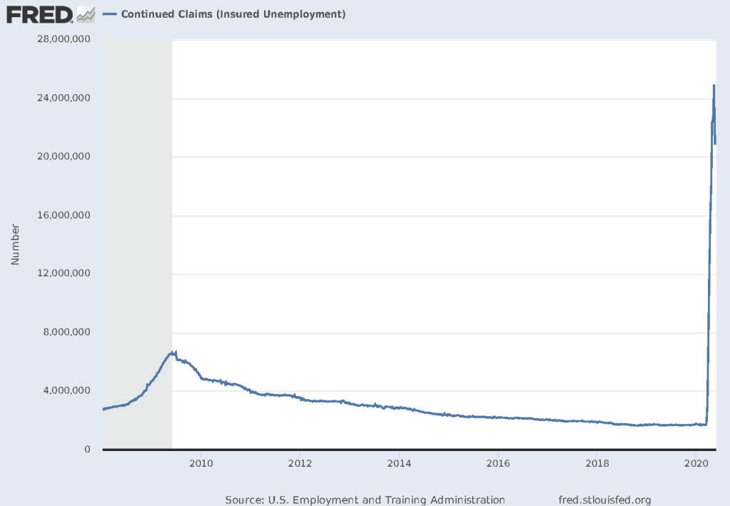 The labor report for May seems to have confirmed the optimism displayed by the stock market. The 2-1/2 million increase in employment is remarkable when considering that more than 12 million workers filed new claims for unemployment insurance between the survey weeks in April and May. This means that a vast number of unemployed workers returned to their jobs last month. This can be seen in the chart showing that the number of persons continuing to collect unemployment insurance benefits has been declining over recent weeks, even as new claims have been on the order of 2 million per week.