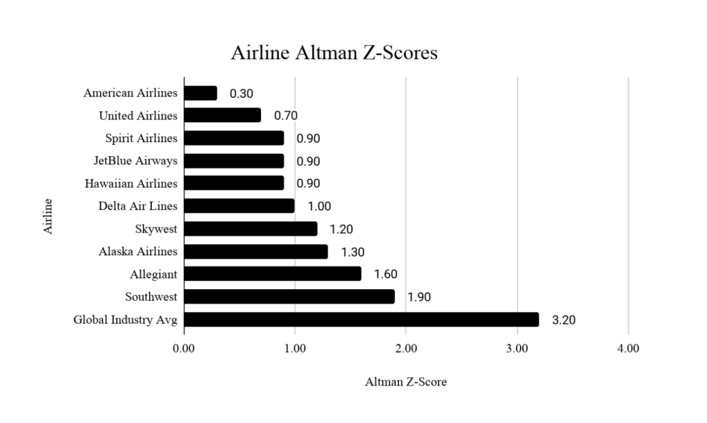 To highlight the gravity of the situation, it’s also worth noting the Altman Z-score metric in reference to likelihood of potential bankruptcies. The score itself comprises five different ratios that try to put the financial state into perspective. The ratios include working capital over total assets, retained earnings over total assets, pre-tax earnings over total assets, market value of equity over total liabilities, and sales over total assets. A Z-score south of 1.8 means the company is likely headed towards bankruptcy, while companies flexing scores above 3 are not likely to go bankrupt. Z-scores for airlines headquartered in the United States are shown below: