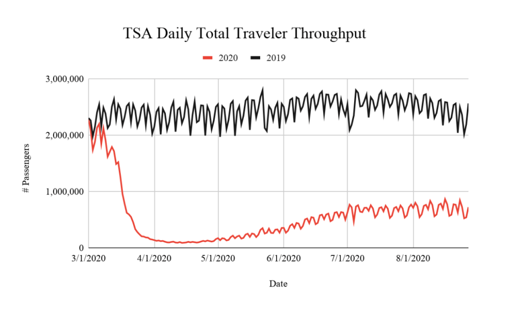 Closures of borders, restrictions on leisure travel, cancelations of business engagements, governmental mandates, and widespread fears of sitting on an airplane with someone harboring COVID-19 were enough to kneecap an already beleaguered industry. To put the decline in travel numbers into perspective, consider the total traveler throughput data collected daily by the TSA – comparing this year to one year ago today (since March).