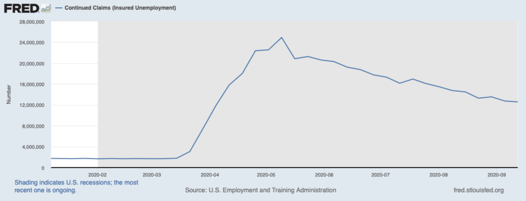 Overall, conditions in the labor market continue to improve, as shown below by the ongoing decline in people continuing to collect unemployment insurance payments. Despite, still-high new claims for unemployment insurance, more are dropping off the rolls and returning to work than going on the rolls. Elevated unemployment is concentrated in the service sector and many of those unemployed service-sector employees will need to look to other sectors of the economy to find work—or be extremely patient.