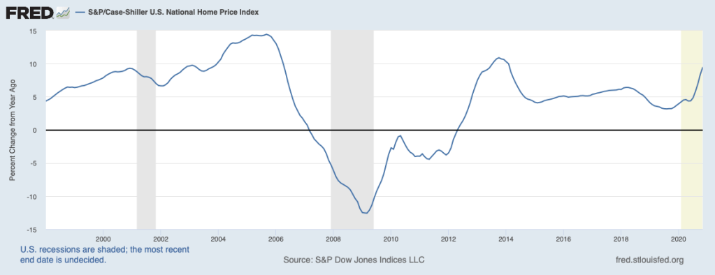 Strong demand for homes has led to an acceleration in home prices, shown below. Home price gains are reaching double digits which could prove worrisome if they persist.