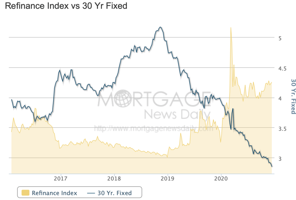 Low mortgage rates have prompted a wave of mortgage refinancing activity, the gold shaded area in the next chart. By refinancing, people are able to lower their monthly mortgage payments, enabling them to spend more on goods and services. Also, many will use the occasion of refinancing to extract equity from their home by taking out a larger mortgage, with the funds extracted becoming available for purchasing big-ticket items—such as cars and light trucks.