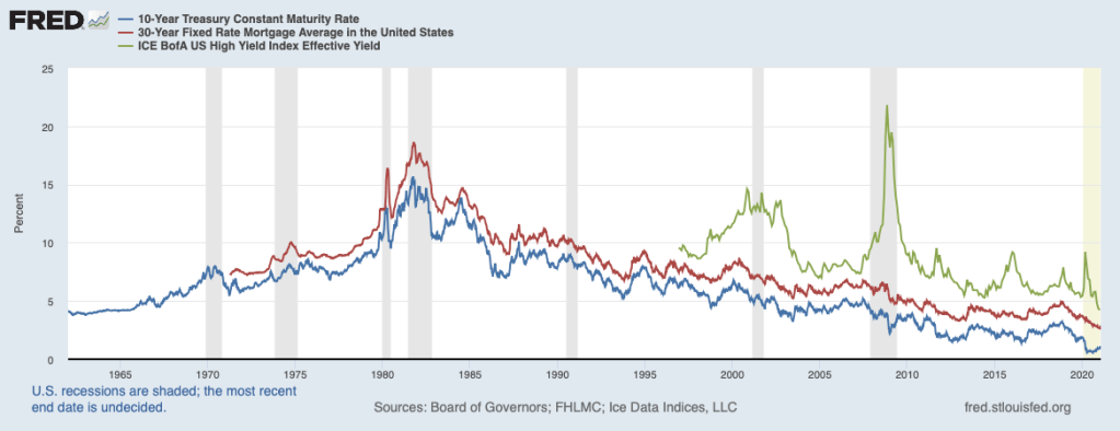 The chart below illustrates that this posture of the Fed has resulted in the yield on the benchmark 10-year Treasury note (the blue line) dropping to historic lows. Moreover, other rates have moved lower, such as the 30-year mortgage rate (the red line) and the corporate junk bond rate (the green line). In these circumstances, return-hungry investors appear to be moving into more risky investments, leading to a re-pricing of risk. As a result, these low-interest rates are having a distinct impact, some in keeping with the Fed’s policy goals and some a little more worrisome.