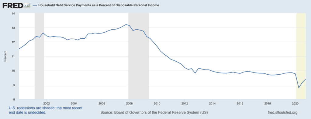 Going forward, the potent mix of very strong demand—powered by the ultra-low interest rate policy of the Fed and outsized fiscal stimulus already in place—pressing against restraints on supply in many sectors of the economy will mean continued upward pressure on prices. On the demand side, consumers are well-positioned to spend based on steady income growth, very strong wealth positions (buoyed by lofty stock prices and soaring home equity), accommodative credit conditions, and extremely low debt-service claims. The next chart illustrates that consumer debt service (interest plus scheduled principal payments relative to disposable personal income) is at historic lows, implying that consumers have plenty of capacity to finance big-ticket purchases in the period ahead. This includes the capacity to purchase homes at historically low mortgage rates (see May 31, 2021 post, The Economy: Housing Bubble Redux?).