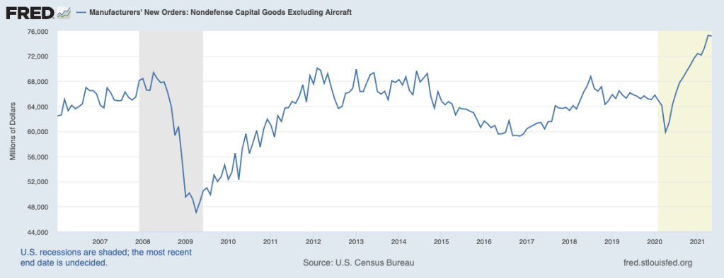 Businesses, too, are well-positioned to undertake new investment based on low financing costs, favorable credit availability, and solid prospects for sales. Indeed, new orders for capital goods (excluding the volatile aircraft component), shown next, have been rising rapidly over the past year and are likely to continue on an upward trajectory.