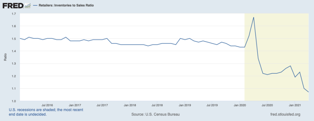 Adding to pressures on resources will be the need for retailers to restock empty shelves. The next chart illustrates that retail inventories are nearly one-third below normal levels (motor vehicle inventories are fully 60 percent below normal). Lack of availability of such goods has been holding down sales across a broad category of items, including homes, for some months.