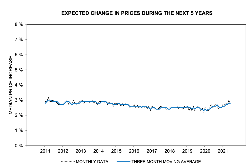 Whether we can avoid inflation becoming a new normal will rest importantly on whether the public comes to expect that inflation will be much higher going forward—that is, whether inflation expectations rise outside the 2 percent area. The chart below has year-ahead expectations of inflation based on the University of Michigan survey of consumers. This measure of inflation expectations has spiked in keeping with the recent pickup in actual inflation. Longer-term inflation expectations of consumers, the next chart, have also moved higher over recent months but are not outside the range of recent history (which was associated with subdued actual inflation).