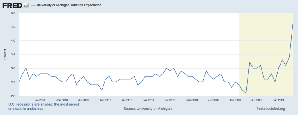 But, like other measures of inflation expectations, this measure is pointed upwards (see June 13, 2021 post). (Note that this measure tends to average around 3 percent even though actual inflation has run well below this pace, a well-known and consistent bias in this survey).