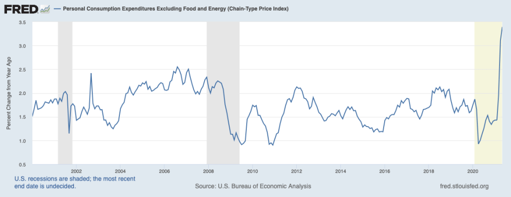 The pickup in inflation in recent months has spurred worries about whether we are entering an uncomfortable new era beset by large price increases. The chart below illustrates that core inflation (which excludes volatile food and energy prices) has spiked recently. For nearly a decade before the pandemic, core inflation ran at a 1-1/2 to 2 percent on a twelve-month basis, but jumped to 3.4 percent in May.