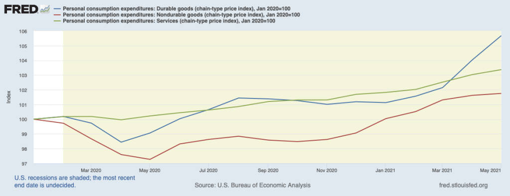 The following chart examines the levels of prices of the principal components of consumer spending—durable goods, nondurable goods, and services—indexed to be 100 in January 2020. Prices of all three categories are now above their pre-Covid levels, even though durable goods prices (blue line) and service prices (red line) fell immediately after the onset of COVID. Since early this year, the prices of both durable goods and services have registered sizable increases, largely reflecting supply restraints interacting with strengthening demand. Is this only a blip on the radar screen, or does it portend that disruptive inflation is becoming the new normal?