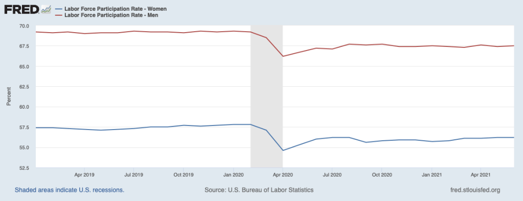 Restraints on supply limited growth in output last quarter. Many of those restraints have come from supply chain disruptions, especially chip shortages. Also, many businesses, notably in the more hard-hit areas of the service sector, have had difficulty drawing workers back to the job. The next chart shows the labor force participation rate for women (blue line) and men (red line). Participation rates for both dropped off markedly at the onset of COVID. Since then, they have recovered only partially, being flat over recent months (the similar pattern for men and women runs counter to the notion that a disproportionate number of women left the labor force during the pandemic to care for children unable to return to daycare or the classroom). It is worth noting that individuals who deem themselves not to be in the labor force are not counted as unemployed; these individuals get counted as being unemployed when they return to the labor force and seek employment or as employed when they take a job.
