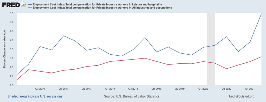 Employers have been posting a record level of vacancies and have been boosting compensation to fill those positions. The chart below shows twelve-month growth in total compensation (wages or salaries and benefits) for all workers in private industry (red line) and for workers in the hospitality sector (primarily restaurants and bars and hotels, blue line). Growth in compensation has crept above the pre-pandemic pace for all private-sector employees, but has surged in the hospitality sector where labor shortages have been most acute. To date, higher wages have been only partially successful in getting people back on the job.
