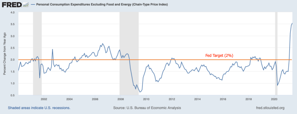 Looking ahead, supply restraints are likely to be easing only slowly in the coming months. As a consequence, the recovery in output will continue to be curbed and outsized price increases for commodities and some services will persist. The next chart illustrates the recent behavior of an index of prices that the Federal Reserve follows closely—the twelve-month change in the Personal Consumption Expenditures Index for all items excluding the volatile food and energy components. It jumped to 3.5 percent in June, well above the target of 2 percent set by the Fed. The Fed has said that it is seeking inflation to average 2 percent over time in order to stabilize inflation expectations around 2 percent. Accordingly, it has said that it is willing to tolerate prices rising moderately faster than 2 percent for a while to make up for shortfalls in recent years. The Fed has also opined that much of the pickup in inflation in recent months reflects transitory forces that will fade in the period ahead. Therefore, the Fed has argued that patience is called for at this time: The public should not panic and come to expect high inflation going forward.