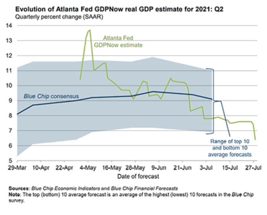 The second quarter turned out to be something of a disappointment. Output was expected to grow at nearly a double-digit pace over much of the quarter, but came in at a 6-1/2 percent rate—little different from the first quarter. This is illustrated in the chart below produced by the staff of the Federal Reserve Bank of Atlanta. The chart shows estimates of growth in real GDP over the course of the second quarter made by the staff of the Atlanta Fed (using a statistical model, green line) and a group of professional forecasters (Blue Chip, the blue line). The Atlanta Fed estimate at one point was as high as 13-1/2 percent and the Blue Chip as high as 9-1/2 percent, but both dropped a considerable amount toward the end of the quarter to about the 6-1/2 percent are—where the actual number came in. The good news is that the level of real GDP finally surpassed the peak in the fourth quarter of 2019, before the onset of the pandemic. The unemployment rate, though, was 5.9 percent—2.4 percentage points above its pre-COVID level—and total hours worked were 4.5 percent below the peak level.