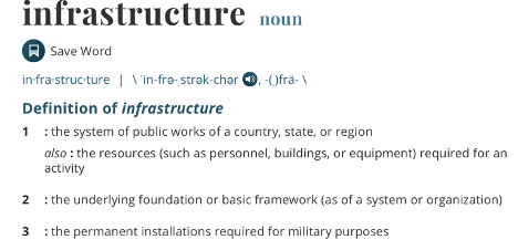Infrastructure is the set of fundamental facilities and systems that support the sustainable functionality of households and firms, serving a country, city, or other areas,[1] including the services and facilities necessary for its economy to function. (Source: Wikipedia)