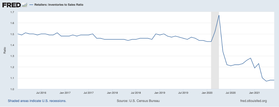 Has the slowdown in the economy owed to demand or supply factors? The next chart, showing the inventory-to-sales ratio at retailers points to supply-side factors, such as the shortage of chips and other supply chain disruptions. Retailers have been struggling to meet customer demands and rebuild their extraordinarily low inventories. This problem has been most acute in the durable goods sector, where the production of cars and light trucks, appliances, TVs, and computers continues to be crimped by long delays in getting chips. Perhaps you have noticed a paucity of cars and light trucks for sale on car lots and what remains has been picked over.