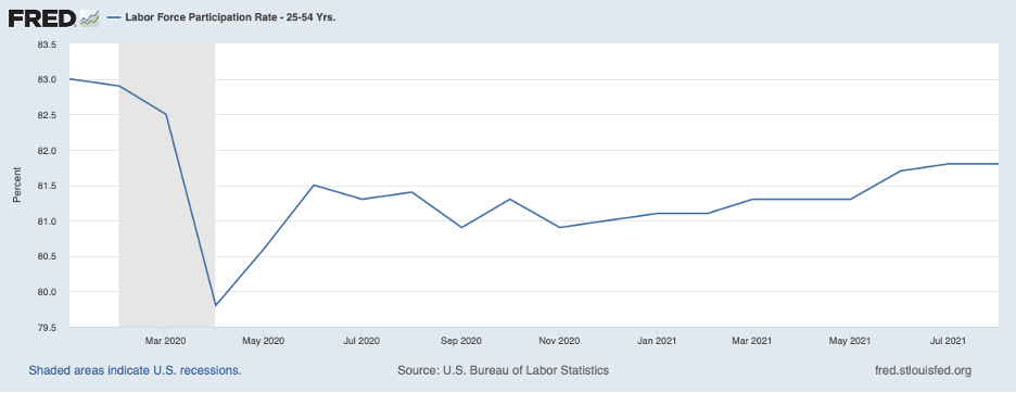 The employment report for August indicated that the slowdown in growth continues into the middle of the current quarter and that worker reluctance to re-enter the labor force is playing a role, another supply-side restraint. The chart below shows the labor force participation rate for persons aged 25 to 54 years, those in their prime working years. The participation rate dropped sharply at the onset of the pandemic and has recovered only a portion of that decline. And this reluctance to re-enter the labor force is happening at a time when job openings are at a historical record.