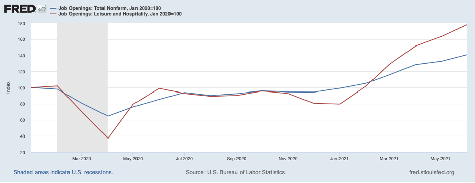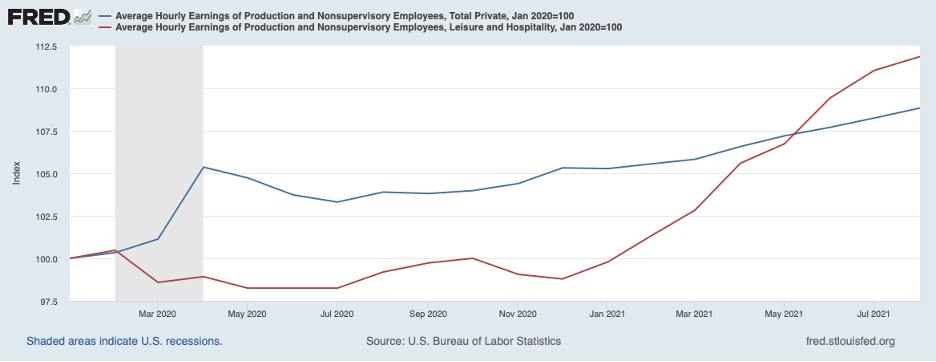 Shown next are job openings posted by nonfarm businesses overall (blue line) and the leisure and hospitality sector (red line), where strains have been most acute. Each is shown in relation to its pre-COVID level. Vacancies are up around 40 percent overall and 80 percent in the leisure and hospitality sector.
