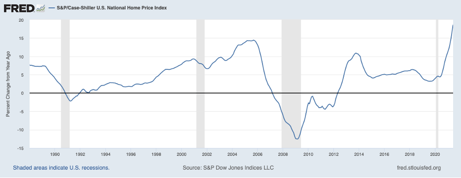 The housing sector continues to face intense price pressures, as shown in the next chart. In recent months, the twelve-month change in home prices has surpassed the pace during the peak of the housing bubble of nearly two decades ago.