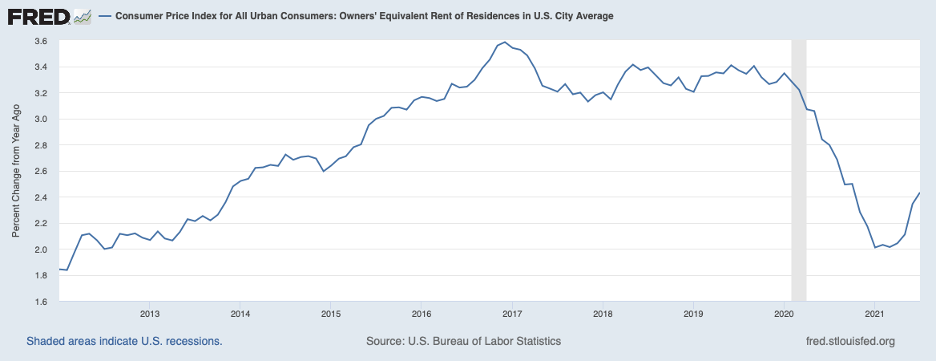 Note that home prices do not enter into measures of consumer prices directly. But they do affect consumer prices indirectly to the extent that they affect rent (including owner’s-equivalent rent). The growth of rent slowed in response to the COVID shock and the moratorium on rent payments, as seen in the next chart. It has picked up recently but is well below its pre-pandemic pace.