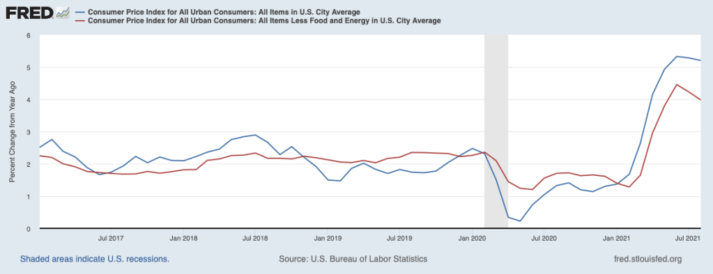 Large price increases over the past year have pushed inflation toward the top of the list of worries in public opinion polls. The 5.2 percent jump in the CPI over the past twelve months shown below (4 percent increase in core prices) has taken a noticeable bite out of consumer purchasing power and has raised concerns about whether the pickup in inflation is only transitory—as the Fed has been arguing—or more lasting.