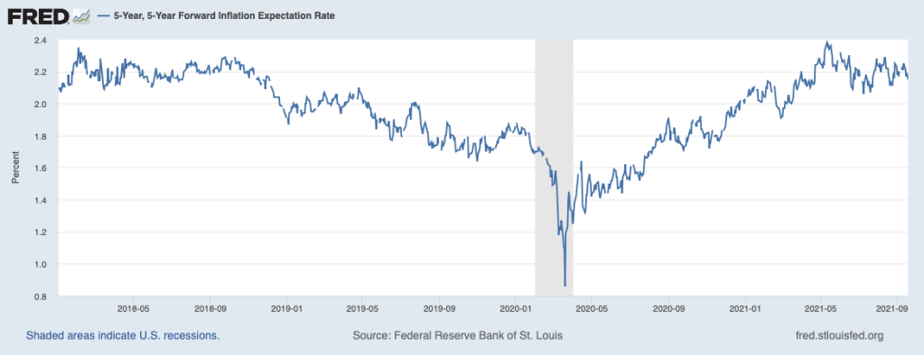 The next chart illustrates consumer long-term inflation expectations from the Michigan survey. The chart shows consumer inflation expectations trending higher this year, as inflation picked up, and reaching the upper end of the range that has prevailed over the past decade.