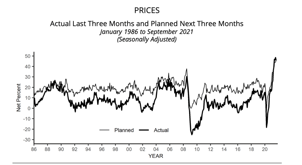 The chart above shows the largest number of sellers in thirty-five years. Similarly, large businesses are reporting in growing numbers that they intend to increase prices over the coming months. This is much like the actions taken by smaller businesses. It is also worth noting that many consumers are expecting price increases.