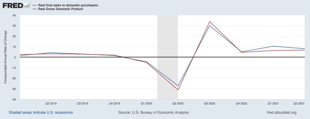 The chart below shows a proxy for growth in aggregate demand (Real Final Sales, the blue line) and production growth (Real GDP, the red line) since early 2019, a year before the onset of the pandemic. Both grew around the same rate over 2019 and both declined sharply over the first half of 2020. In response to the COVID shock, consumers and businesses cut spending on all but the bare necessities while producers slashed production across the board in response to the lockdown. Note that production plunged more than demand in the second quarter of last year when the brunt of the pandemic shock was felt on the economy. This contrasts with typical downturns in which demand falls more than production, a point we will come back to.