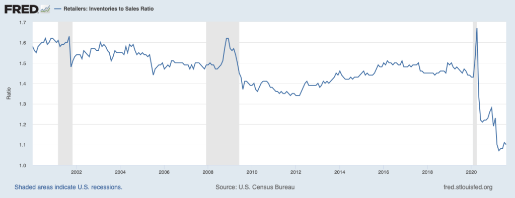 The impact of production disruptions is visible in retail inventories, shown in the chart below. The inventory-sales ratio being presented understates the paucity of inventories because sales in the denominator have been held down by the lack of available goods. The chart shows that inventories are way out of line with historical experience. Moreover, not only are retailers going to be rebuilding stocks to previous levels, but as noted they will be wanting to add a precautionary cushion which will prolong strains on producers of goods.