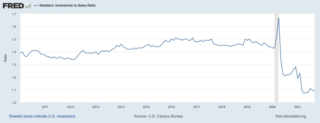 With demand remaining very strong and producers struggling to catch up, retail inventories of goods remain uncomfortably lean— the next chart.