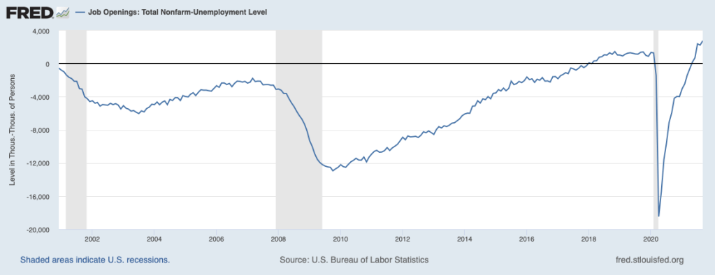 In addition to supply-chain bottlenecks, tautness in the labor market is raising costs to sellers and adding to inflation pressures. This tautness is illustrated by the chart below, showing the excess of job openings over the number of unemployed persons. The gap moved into record territory in September (most recent data).