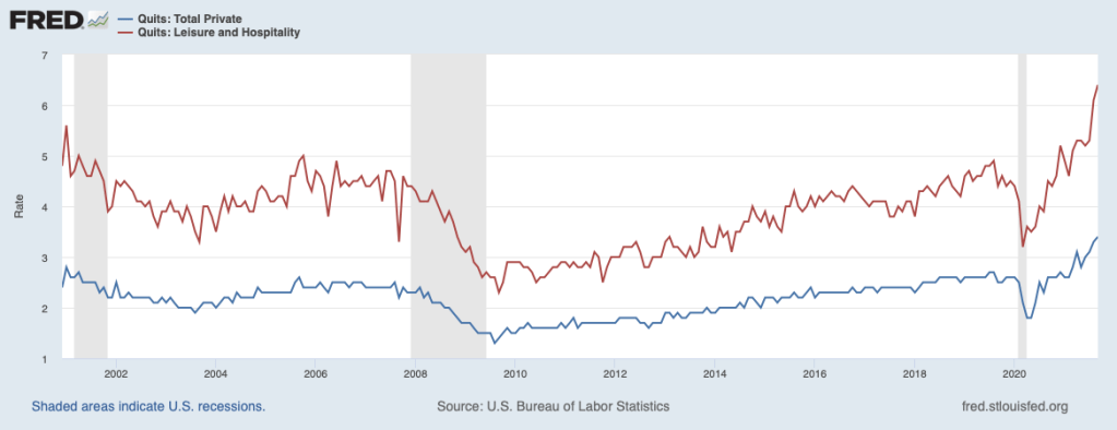 Also reflecting tautness in the labor market is the record number of quits, shown next. People quit jobs in droves when they are sure that they can find a better job quickly. The blue line is the quits rate faced by all private-sector employers, and the red line is the rate for employers in the leisure and hospitality sector. Both have risen sharply this year, with the quits rate in the leisure and hospitality sector outpacing other sectors.