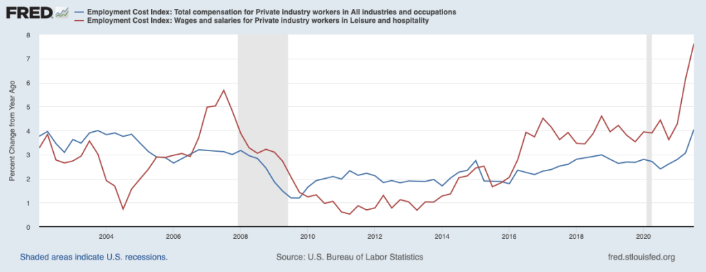 In response, employers have been trying to retain current employees and attract new employees by aggressively raising compensation, shown next. The blue line shows the twelve-month change in compensation (wages and salaries and benefits) for all workers in the private sector and the red line shows growth in compensation in the leisure and hospitality sector.