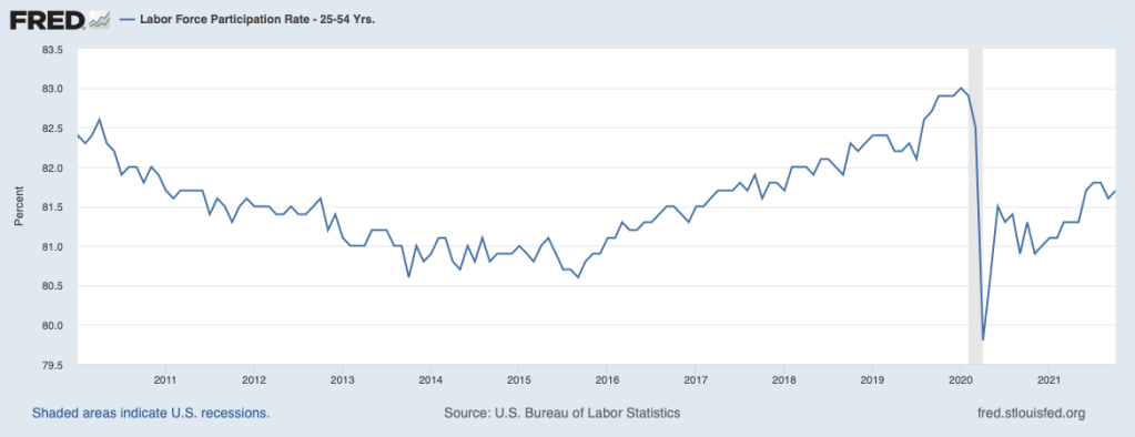 Adding to strains in the labor market has been a reluctance to return to the labor force on the part of workers who dropped out of the labor force when COVID hit. This reluctance is shown in the chart below depicting the labor force participation rate for prime-age workers. Participation rebounded shortly after the pandemic shock hit.
