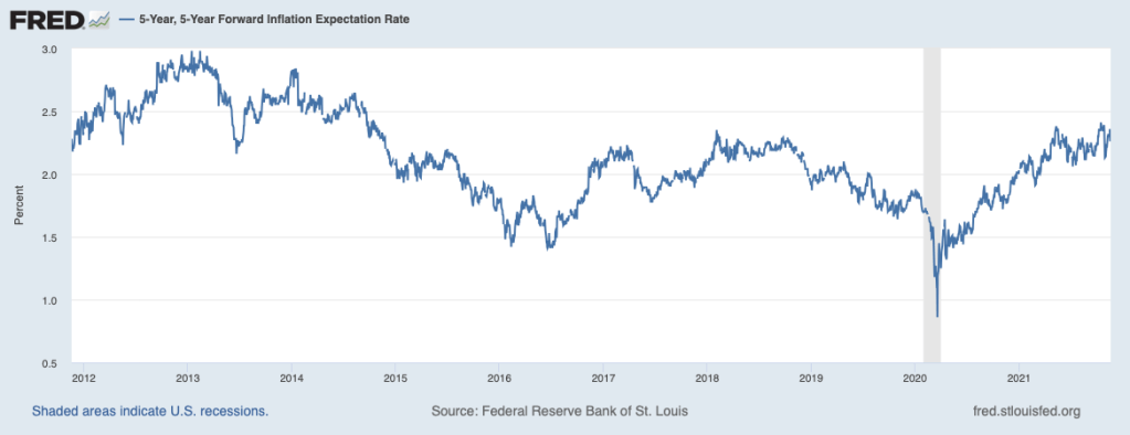 The above discussion implies that outsized price increases are likely to continue for as long as supply-chain disruptions persist, which could be another year. A critical issue is whether inflation has meanwhile gained enough momentum that it will continue after supply-chain strains have been relieved. Much depends on whether longer-term inflation expectations move above a range consistent with the Fed’s 2 percent inflation target. Shown next is an indicator of longer-term inflation expectations, based on Treasury security yields—so-called inflation compensation for the five-year period starting in five years. This indicator of inflation expectations has moved above pre-COVID levels. However, this measure has not moved outside the range of the past decade, when actual inflation tended to be below the Fed’s 2 percent target and has not moved much over recent weeks despite the bad news on the inflation front.