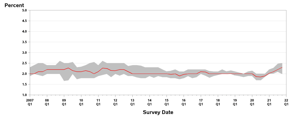 In contrast, the most recent survey of professional forecasters shows longer-term inflation expectations continuing to rise and move outside the range of the past decade and a half—the chart below.