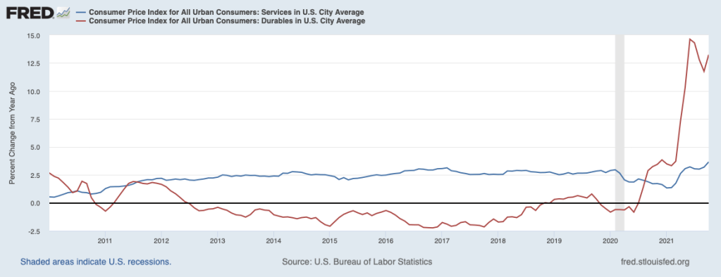 As noted in previous commentaries (See: October 25, 2021, Placing the Economic Expansion in Perspective; October 8, 2021, Supply Restraints Continue to Bedevil the Economic Expansion; and September 18, 2021, Has the Inflation Dragon Been Slayed?), supply chain disruptions have been boosting the prices of consumer goods while strains in the labor market have been putting upward pressure on the prices of services as well as goods. The upturn in goods and services inflation is illustrated in the chart below which shows the twelve-month rate of change of prices of consumer durable goods (the red line) and services (the blue line)—both components of the CPI. The chart shows that the prices of consumer durables tend to decline mildly over time while prices of services typically increase around 2.5 percent each year. This year, though, prices of durable goods have surged to roughly a 12.5 percent rate while the increase in the prices of services has climbed to a 3.5 percent rate. (Not shown is the change in prices of nondurable goods which have had a pattern similar to that of the prices of durables but a muted swing.)