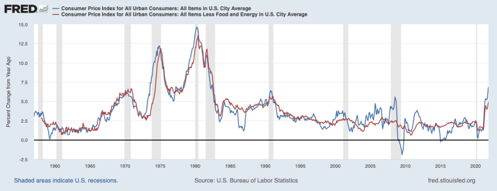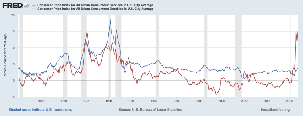 The situation has changed dramatically since August 2020. Inflation has soared. The chart below shows that the headline CPI rose nearly 7 percent over the twelve months ending in November while the core CPI (which excludes volatile food and energy prices) rose 5 percent. Increases in this order were last seen more than thirty years ago. The next chart shows that the prices of services have turned up in the past year but are still are inside the range of recent decades. In contrast, prices of durable goods are rising at a pace not seen in the post-WWII period.