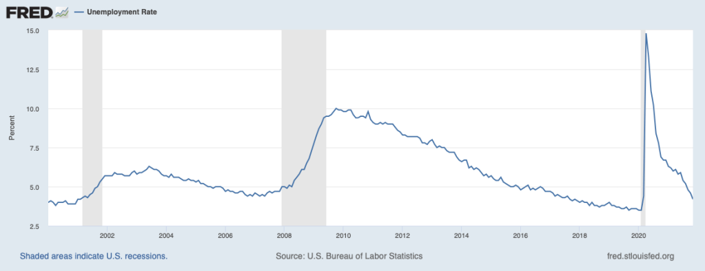 At issue is whether the third condition—maximum employment—has been met. Unfortunately, we do not have a single metric that tells us when maximum employment has been reached. The Fed and many others have focused primarily on the unemployment rate. The unemployment rate dropped to 4.2 percent in November, down markedly from the April 2020 peak of 14.8 percent. The unemployment rate in November was close to the rate that the Fed deems to be consistent with maximum sustainable employment—4.0 percent.