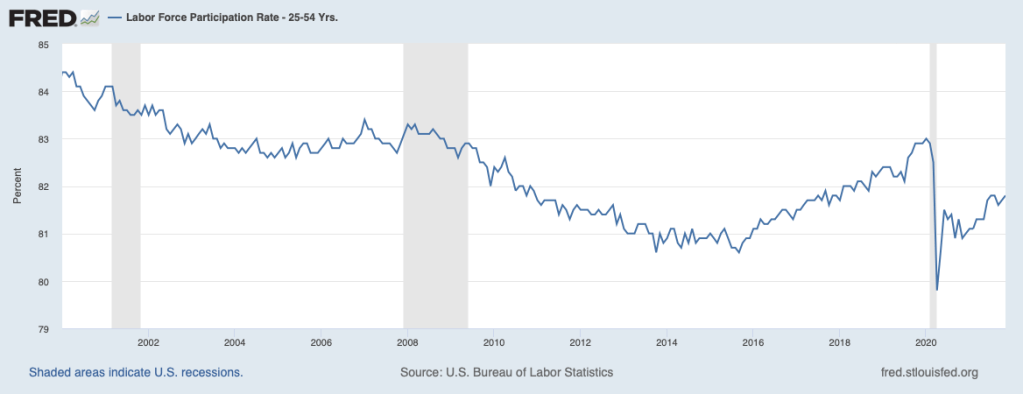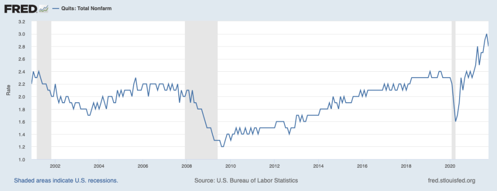 Inflation at this point has been building momentum. Contributing to that momentum have been ongoing supply chain disruptions as well as difficulties in getting workers to come back to the labor force. The next chart—depicting the inventory-sales ratio for the retail sector—shows that retail inventories have been depleted by supply chain disruptions and there has been little improvement over recent months. Furthermore, it appears that supply-chain disruptions are going to take the better part of another year or longer to be worked through. Similarly, it appears that under current circumstances workers choosing to sit on the sidelines are unlikely to be returning to the labor force.