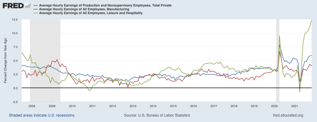 Strains in the labor market are further indicated by wages. Shown in the next chart is the twelve-month change in average hourly earnings for all production and nonsupervisory workers in the private sector (the blue line), for manufacturing workers (the red line), and leisure and hospitality workers (the green line). All three have picked up appreciably over recent months and are near or above their fastest pace in the past decade or so, especially in the leisure and hospitality sector. Moreover, surveys of employers indicate that we can expect more of the same in the coming months. For example, in the most recent survey of small businesses (for November) by the National Federation of Independent Businesses (NFIB), the proportion of respondents that intend to raise compensation in the next three months remains at a record (32 percent).