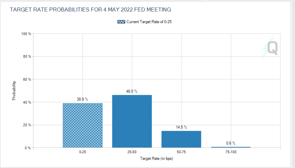 The next chart shows expectations by market participants for the federal funds rate at year-end 2022. Market participants see the odds of rate hikes that amount to less than 75 basis points as 40 percent but also the odds of greater hikes as 30 percent. These rate expectations are broadly consistent with those of the Fed.