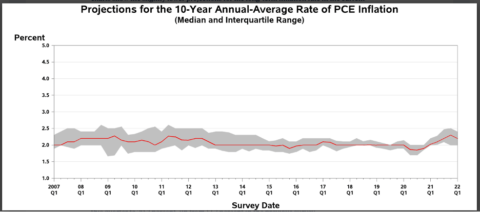 These forecasters also foresee inflation over the coming ten years being elevated and above the Fed’s 2 percent target, shown below.