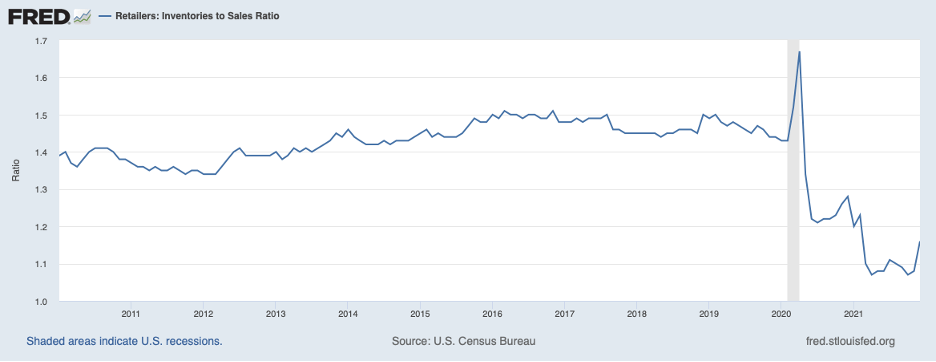 Currently, the economy can be characterized by substantial demand—coming from Fed policy and fiscal stimulus—pressing against restrained supply. The more uncertain outlook for the economy and prices is no doubt adding to caution by consumers and businesses, but there remains a considerable amount of pent-up demand for goods that will keep the economy moving forward for some time. Moreover, the depletion of inventories at the retail level appears to have come to an end, the next chart, but inventory investment has a long way to go before returning to pre-COVID levels, which reflected the now-discredited just-in-time lean inventory management strategy. Efforts by retailers to rebuild depleted stocks—including to more comfortable levels than during the pre-COVID period—will be adding to pressures on producers and prices.