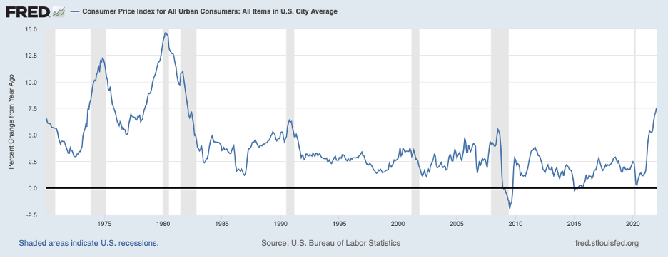 The recent news on the economy has been disappointing. The CPI rose 7.5 percent over the twelve months ending in January, shown in the chart below. This increase is the briskest since March 1982. Moreover, outsized price increases have become more widespread across various categories of goods and services, an indication that inflation has become more entrenched.