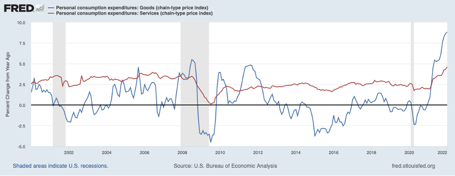 As noted in other commentaries, inflation over 2021 was boosted by supply chain disruptions—especially for microchips and goods that utilize microchips—and by a reluctance of some workers to return to the workforce despite an abundance of jobs. Supply chain disruptions primarily affect goods prices, represented by the blue line in the chart below. Over recent decades, goods prices had been subdued on balance but have climbed to the double-digit area in the past couple of months. Labor shortages have been affecting the prices of both goods and services, with some service prices affected appreciably. The red line in the chart above illustrates that service prices also have accelerated a good bit over the past year.