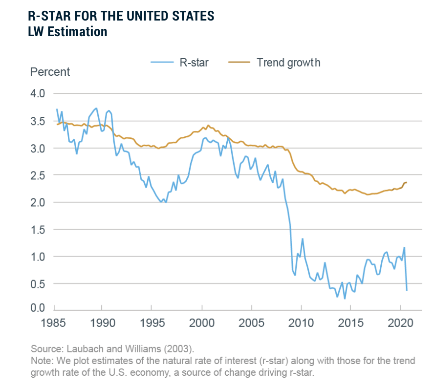 Will increases of 150 to 175 basis points in the federal funds rate be enough? The next chart shows the neutral real federal funds rate (R-star, the blue line)—that is, the extent to which interest rates must exceed the underlying rate of inflation for monetary policy to be neither stimulative nor restrictive. The most recent reading for the real neutral rate is around 50 basis points. The actual real interest rate currently is deeply negative because the Fed is setting the nominal federal funds rate at near-zero and inflation is running high.