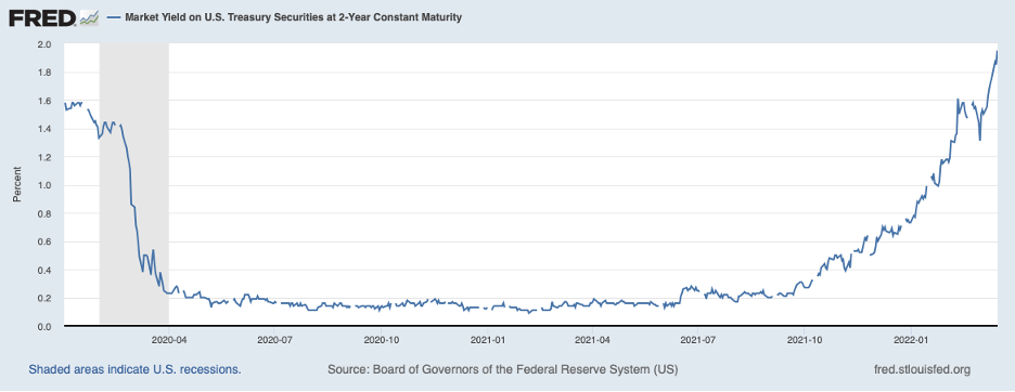 In light of these considerations, the federal funds rate will need to be raised above the underlying rate of inflation by some margin (that is, the real federal funds rate will need to be distinctly in positive territory), implying that the Fed will need to increase the federal funds rate well above the 2.8 percent level that was included in their recent projections. Financial market participants also have come to expect the federal funds rate to rise above 2.8 percent. The next chart shows the interest rate on a two-year Treasury note which has risen sharply in recent weeks to 1.95 percent. This rate on the two-year note implies that the federal funds rate is expected to be nearly 3.25 percent by the end of next year, 50 basis points above the Fed’s expectation.