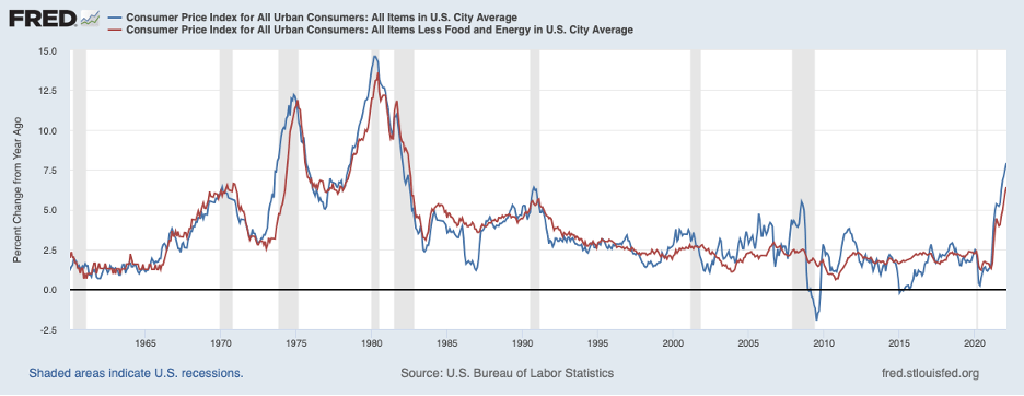 The latest news on the inflation front has not gotten any better. The Consumer Price Index (CPI) rose 7.9 percent over the twelve months ending in February, the blue line in the chart below, and, even after removing escalating food and energy prices, the CPI rose 6.4 percent, the red line.