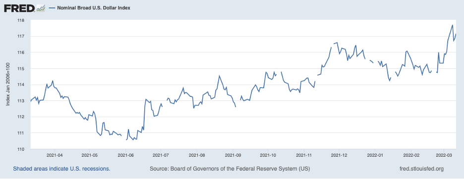 Further pointing to high inflation in the months ahead is the most recent survey by the National Federation of Independent Businesses (NFIB); nearly the same proportion of small businesses that raised their sale prices in the past three months, the thick line in the chart below, noted that they plan to raise their sale prices in the coming three months, the thin line. Additionally, once the dollar stops strengthening, this restraining force that has been holding down the prices of imports will be removed.